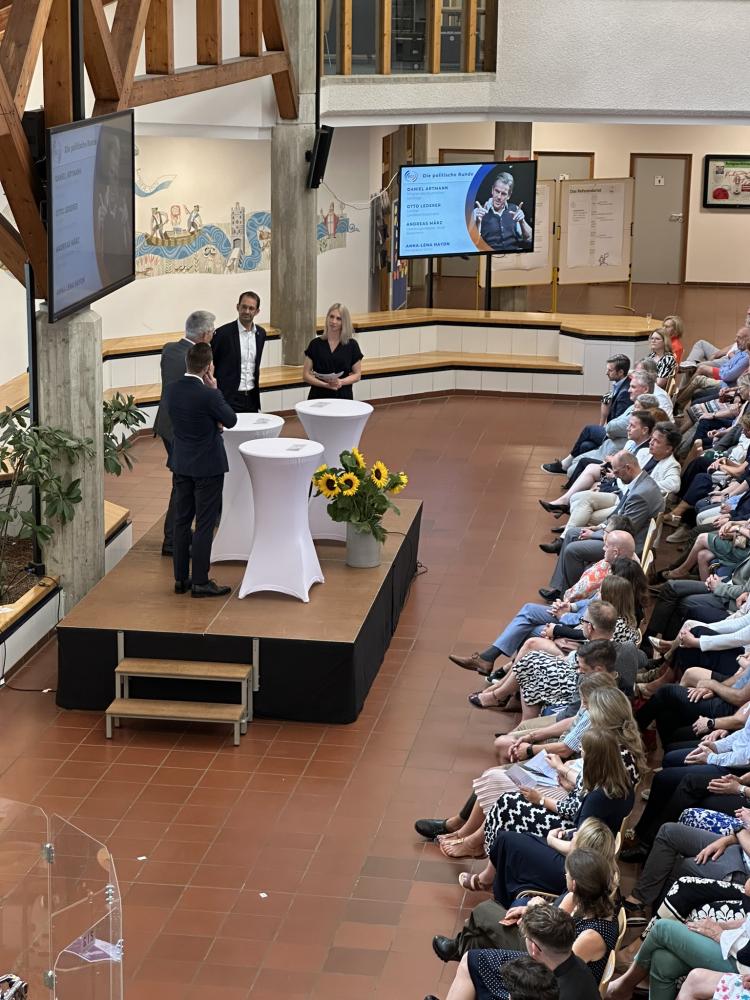 In einer lebendigen Podiumsdiskussion, moderiert von der Schülerin Anna-Lena Haydn, diskutierten Oberbürgermeister Andreas März, Landtagsabgeordneter Daniel Artmann und Landrat Otto Lederer über die Zukunft des Bildungssystems. März sprach sich für ein inklusives Bildungssystem aus: „Nicht jeder muss Abitur machen – aber jeder verdient eine gute Ausbildung.“ Artmann hob die Bedeutung der beruflichen Bildung für den technologischen Fortschritt hervor, der in den Betrieben stattfinde. Lederer betonte, wie wichtig es sei, Fachkräfte durch attraktive Bildungsangebote in der Region zu halten. Ein humorvoller Moment entstand, als Haydn fragte, wer in der Schulzeit einen Verweis erhalten habe – und alle drei Politiker die Hand hoben.